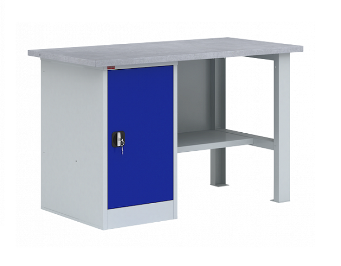Металлические слесарный верстак ВП-2/1,2 представляет собой рабочий стол для ручной обработки металлических, деревянных изделий, а также предметов, выполненных из других материалов. Металлический верстак используется в мастерских, гаражах, автосервисах и в других рабочих зонах. Он являются основой, как небольшого промышленного производства, так и крупного предприятия. Допустимая равномерно распределенная нагрузка на верстак - 1000 кг, на полку верстачную - 40 кг, на полку тумбы- 30 кг. В комплект верстака ВП-2/1,2 входит: столешница СТ-1,2 из МДФ, покрытая оцинкованным листовым металлом, стенка задняя металлическая, металлическая верстачная опора, тумба Т-1 с двумя съемными полками. Дверь тумбы закрывается ключевым замком. Тумбу можно установить как с левой, так и правой стороны верстака. Дополнительно на верстак можно установить перфорированный экран соответствующего размера, аксессуары на экран. Цвет: верстак - серый Ral 7035, дверь тумбы - синий Ral 5002